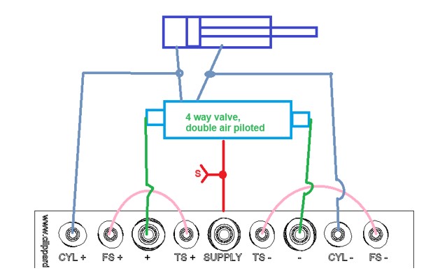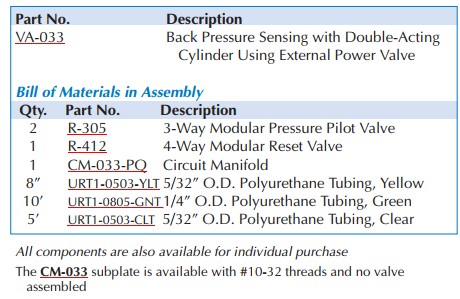 The VA-033 module is very similar to the VA-031 for controlling a double-acting cylinder without limits. The circuit uses back pressure to send a signal when the cylinder finishes moving.